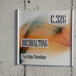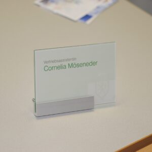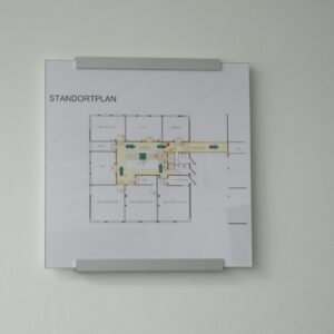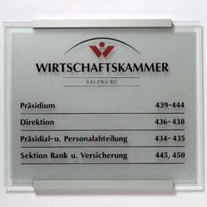 ESG Glasschilder mit Eloxal-Glashalter silber, montagefertig zur Schraubmontage mittels Flachkopfschrauben.