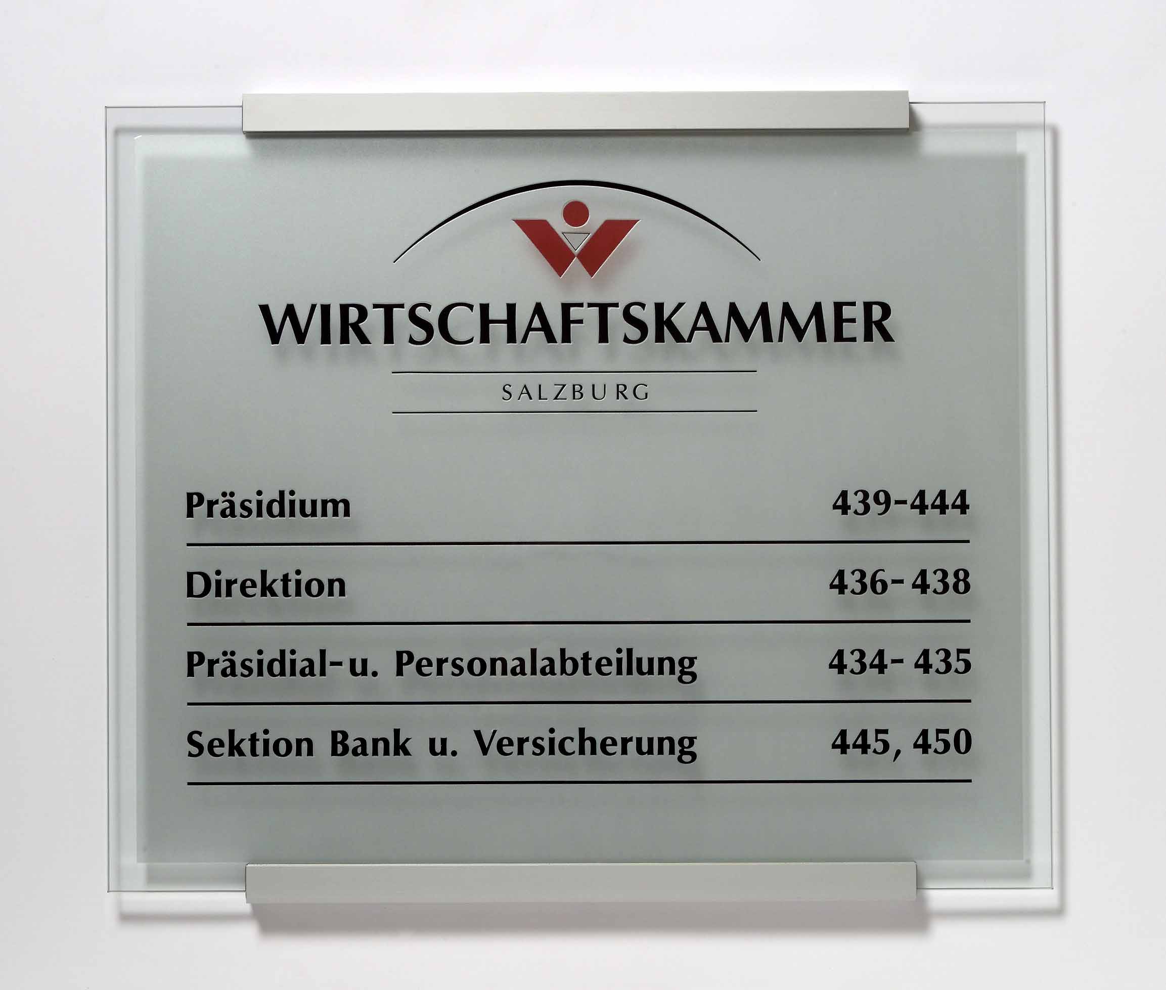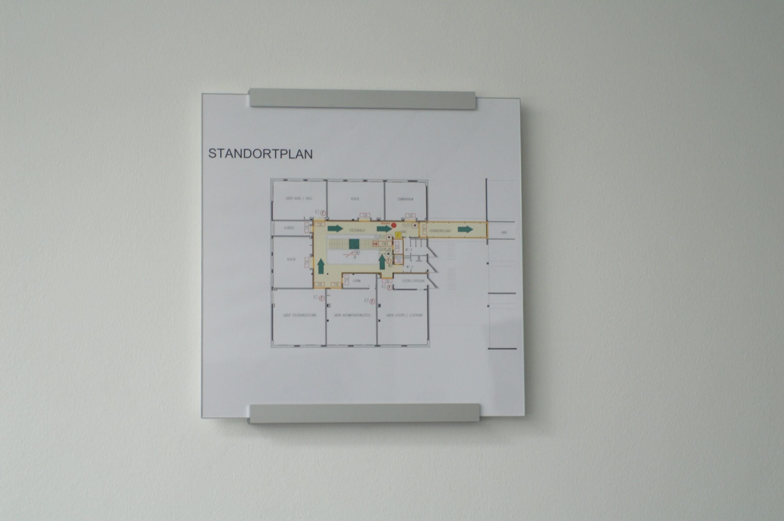 - Mit einer Alu-Montageleiste wird das Kristallino Infoschild G-Kurz mit einem Glashalter an der Wand befestigt.