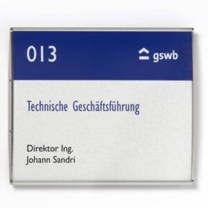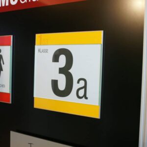 Die gesamte Beschilderung muss ein einheitliches Erscheinungsbild aufweisen. Alle Schilder müssen langjährig nachkaufbar sein, damit gewährleistet ist, dass bei Erweiterung das ursprüngliche Erscheinungsbild gewahrt wird. Die nachfolgend beschriebene Schilderausführung ist als Vorzugsleistung der Architekten zu verstehen. Alle Maßangaben in dieser Leistungsbeschreibung sind Breite x Höhe. Auf alle Komponenten der Vexo Schilder Serie besteht eine zehnjährige Nachkaufgarantie.